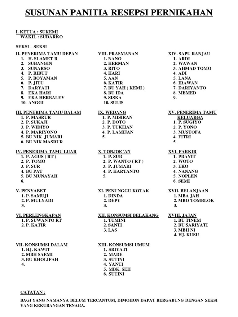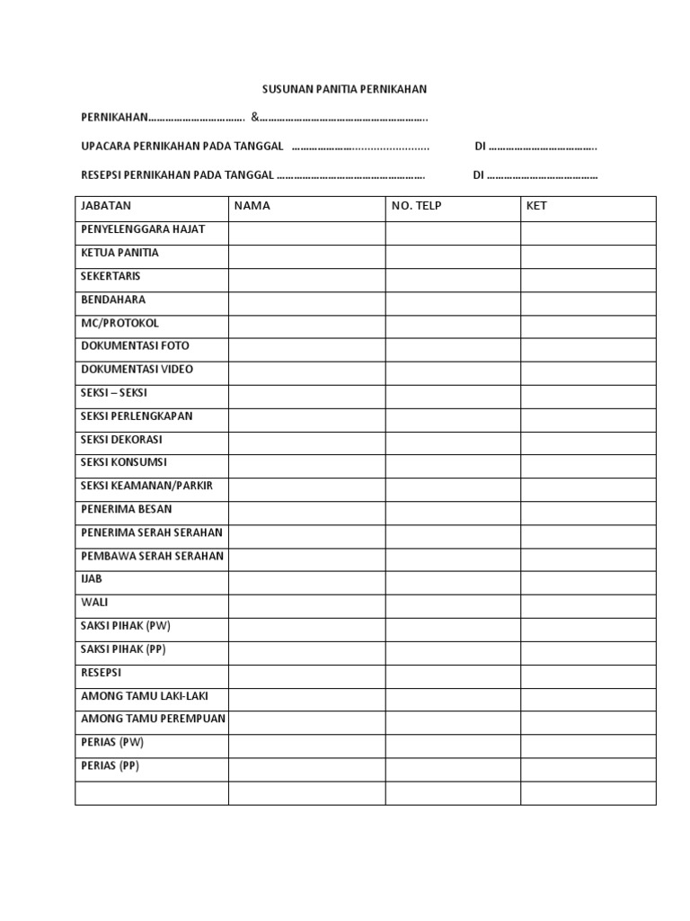 Paling Keren. Apakah susunan kepanitiaan sebuah acara pernikahan sama dengan kepanitiaan acara lain? Dibawah ini merupakan beberapa seksi bagian kepanitiaan pernikahan yang akan diuraikan secara ringkas supaya mudah untuk dipahami, sebagao. Adanya susunan panitia pernikahan ini berguna untuk memastikan sebuah acara bisa berjalan dengan baik dan lancer hingga acara selesai.
